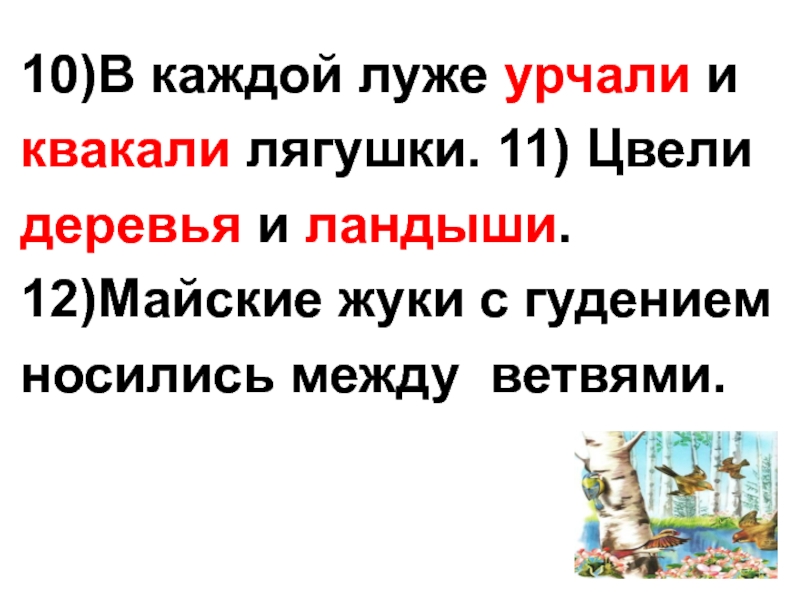 10)В каждой луже урчали иквакали лягушки. 11) Цвелидеревья и ландыши. 12)Майские жуки с гудениемносились между ветвями.