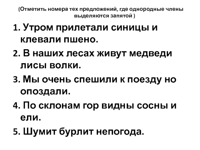 Слайд 24(Отметить номера тех предложений, где однородные члены выделяются запятой )