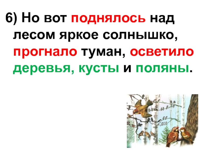 6) Но вот поднялось над лесом яркое солнышко, прогнало туман, осветило деревья, кусты и поляны.