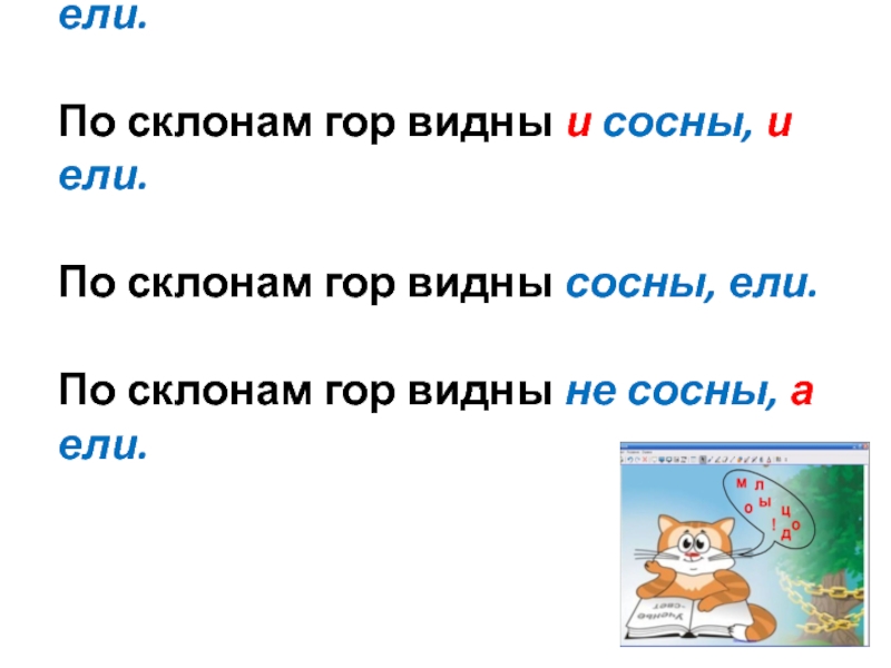 По склонам гор видны сосны и ели.По склонам гор видны и сосны, и ели.По склонам гор видны