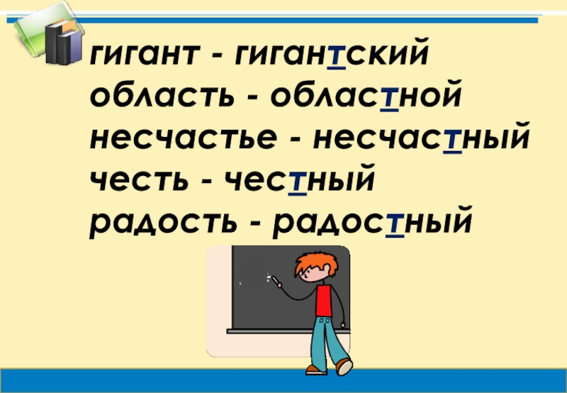 гигант - гигантскийобласть - областнойнесчастье - несчастныйчесть - честныйрадость - радостный