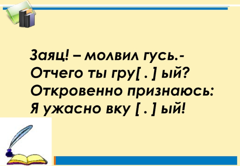 Заяц! – молвил гусь.-Отчего ты гру[ . ] ый?Откровенно признаюсь:Я ужасно вку [ . ] ый!