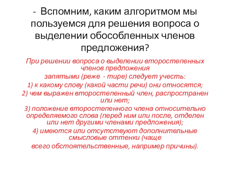 3) положение второстепенного члена относительно определяемого слова (перед ним или после, отделен или нет другими членами предложения);