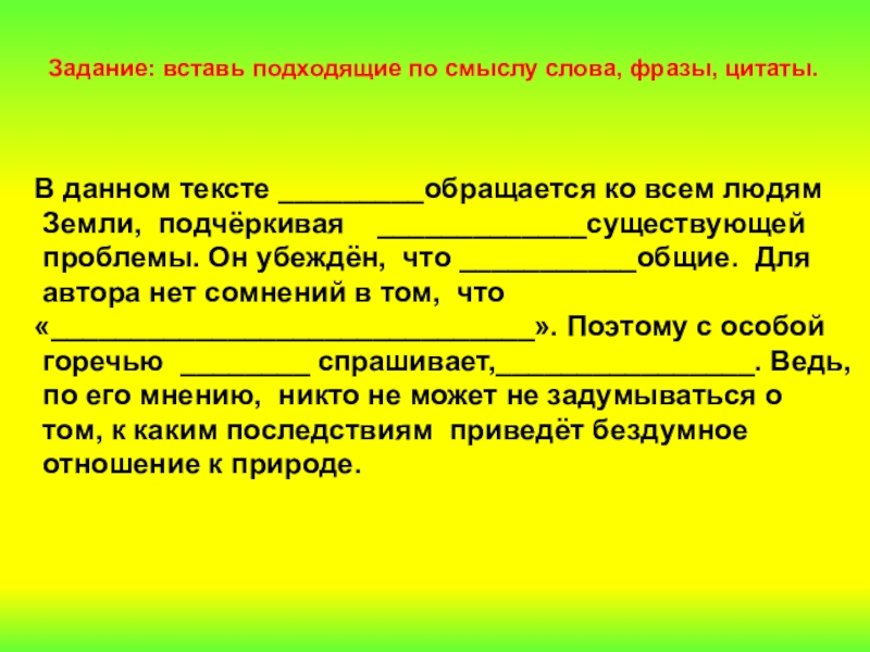 Слайд 13Задание: вставь подходящие по смыслу слова, фразы, цитаты.