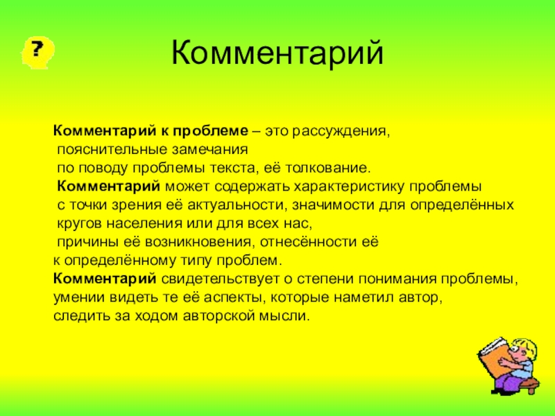 рассуждение, пояснение по поводу проблемы текста, её толкование.