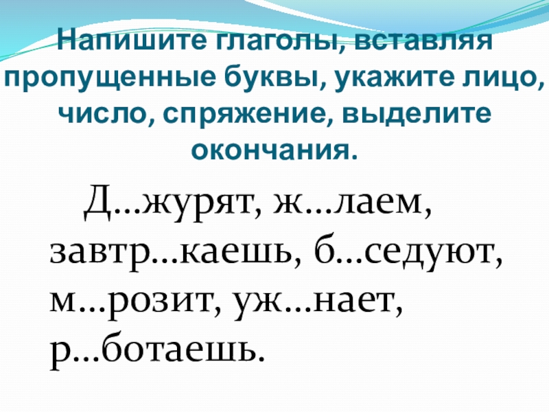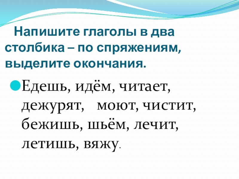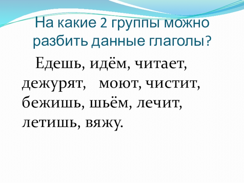 Едешь, идём, читает, дежурят, моют, чистит, бежишь, шьём, лечит, летишь, вяжу.