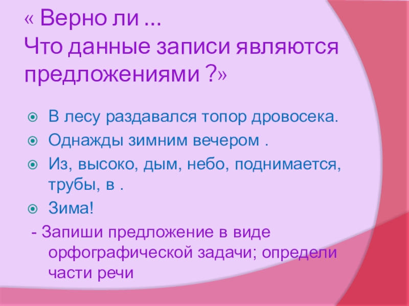 - Запиши предложение в виде орфографической задачи; определи части речи