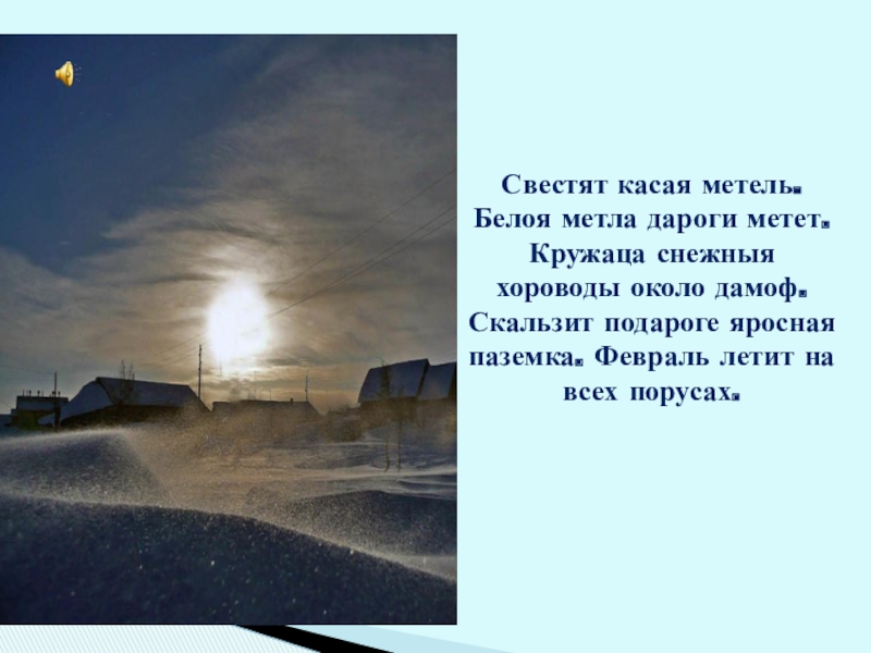 Слайд 17Свестят касая метель. Белоя метла дароги метет. Кружаца снежныя хороводы около