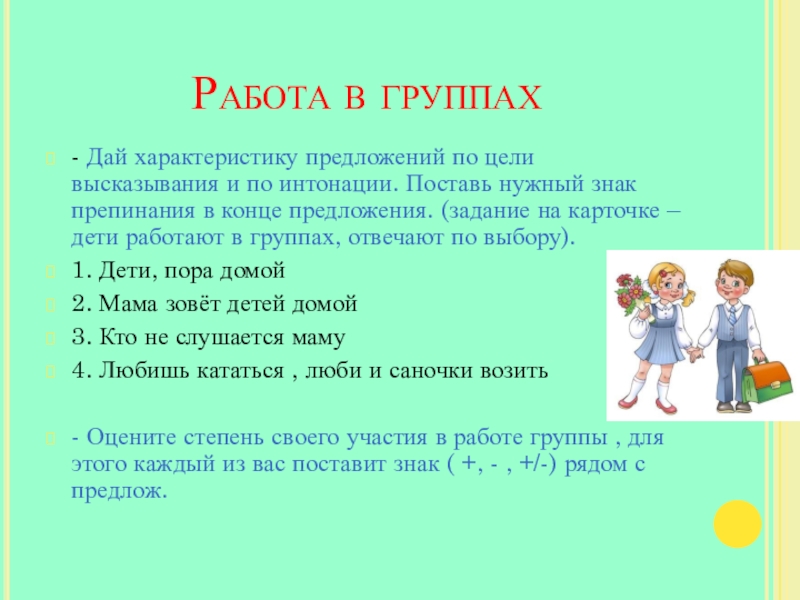 интонации. Поставь нужный знак препинания в конце предложения. (задание на карточке – дети работают в группах, отвечают по выбору).