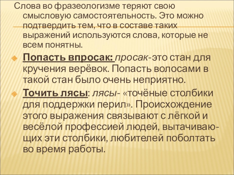 Слайд 11Слова во фразеологизме теряют свою смысловую самостоятельность. Это можно подтвердить тем,