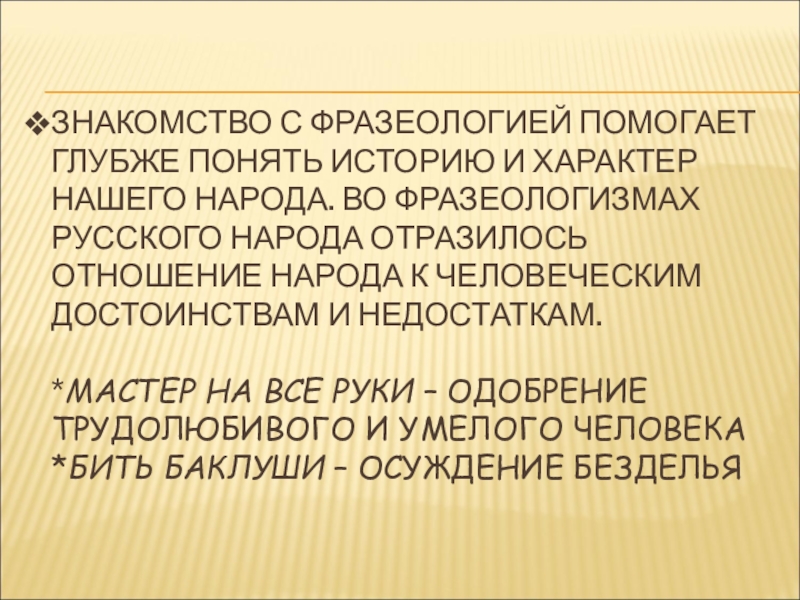 Слайд 8ЗНАКОМСТВО С ФРАЗЕОЛОГИЕЙ ПОМОГАЕТ ГЛУБЖЕ ПОНЯТЬ ИСТОРИЮ И ХАРАКТЕР НАШЕГО НАРОДА.