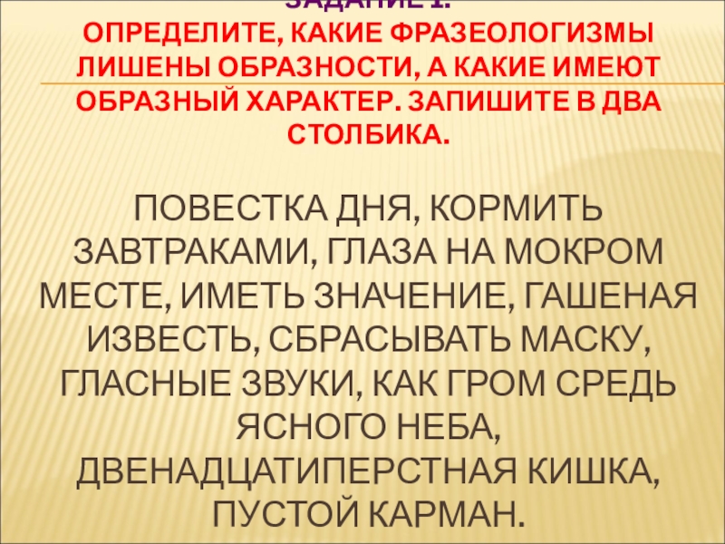 ПОВЕСТКА ДНЯ, КОРМИТЬ ЗАВТРАКАМИ, ГЛАЗА НА МОКРОМ МЕСТЕ, ИМЕТЬ ЗНАЧЕНИЕ, ГАШЕНАЯ ИЗВЕСТЬ, СБРАСЫВАТЬ МАСКУ, ГЛАСНЫЕ ЗВУКИ, КАК ГРОМ СРЕДЬ ЯСНОГО НЕБА, ДВЕНАДЦАТИПЕРСТНАЯ КИШКА, ПУСТОЙ КАРМАН.