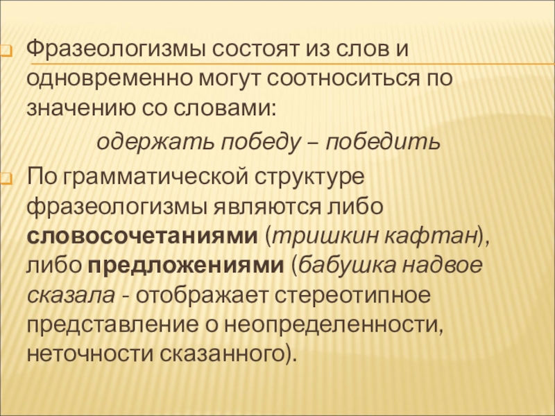 Слайд 7Фразеологизмы состоят из слов и одновременно могут соотноситься по значению со