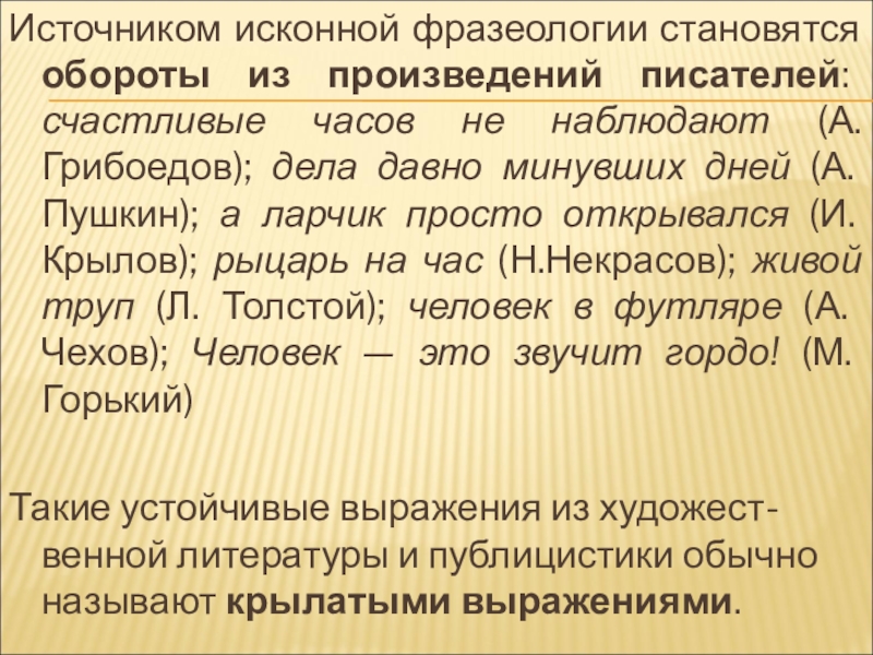 наблюдают (А.Грибоедов); дела давно минувших дней (А. Пушкин); а ларчик просто открывался (И. Крылов); рыцарь на час (Н.Некрасов); живой труп (Л. Толстой); человек в футляре (А. Чехов); Человек — это звучит гордо! (М. Горький)