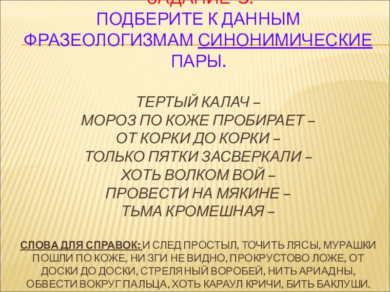 ПОДБЕРИТЕ К ДАННЫМ ФРАЗЕОЛОГИЗМАМ СИНОНИМИЧЕСКИЕ ПАРЫ.