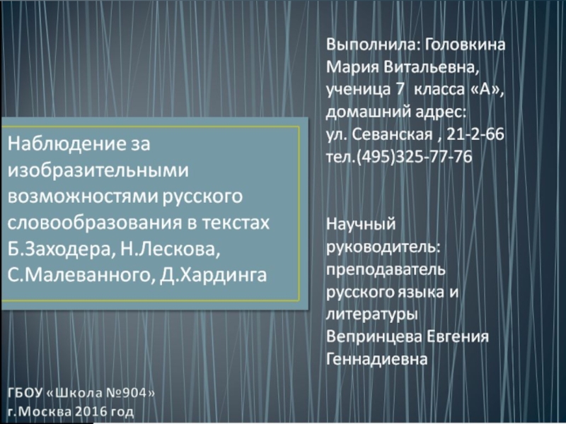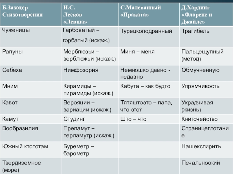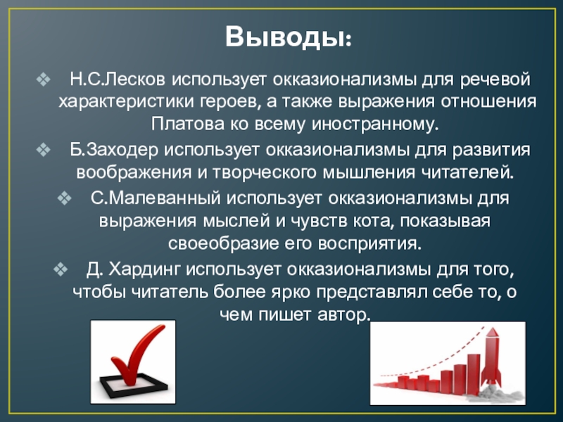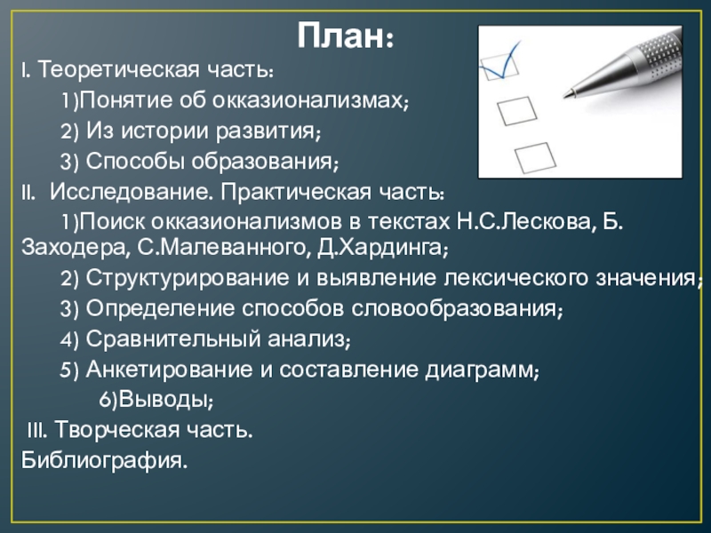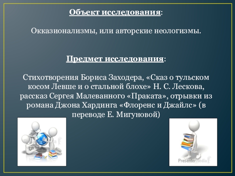 1)Поиск окказионализмов в текстах Н.С.Лескова, Б.Заходера, С.Малеванного, Д.Хардинга;