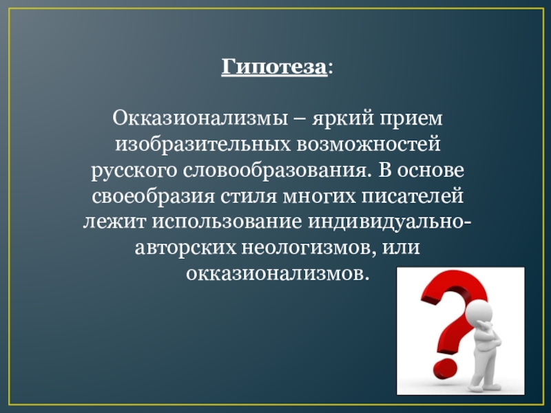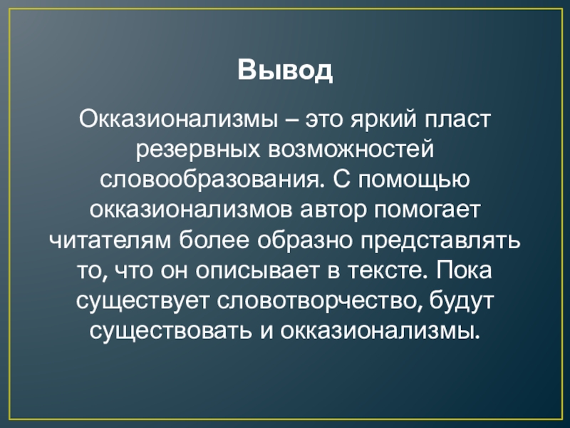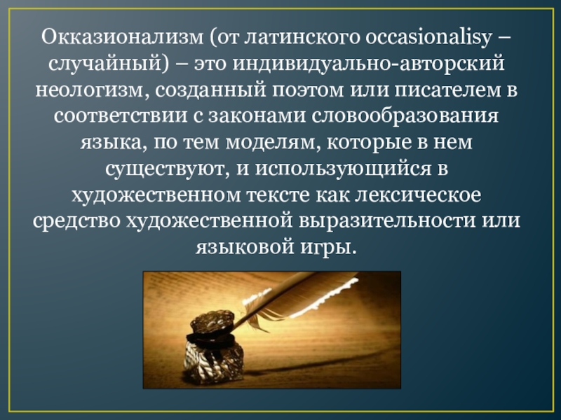 Слайд 12Окказионализм (от латинского occasionalisy – случайный) – это индивидуально-авторский неологизм, созданный