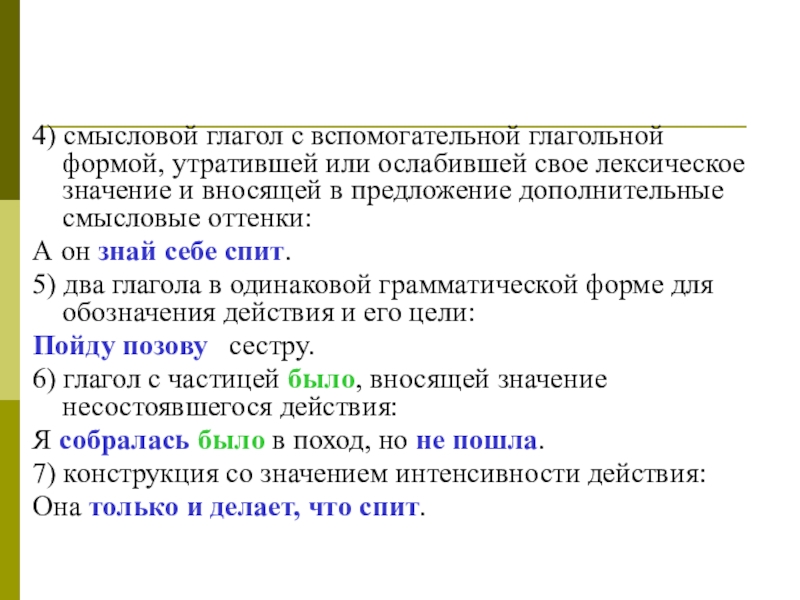 4) смысловой глагол с вспомогательной глагольной формой, утратившей или ослабившей свое лексическое