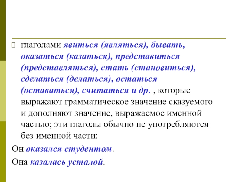(делаться), остаться (оставаться), считаться и др. , которые выражают грамматическое значение сказуемого и дополняют значение, выражаемое именной частью; эти глаголы обычно не употребляются без именной части: