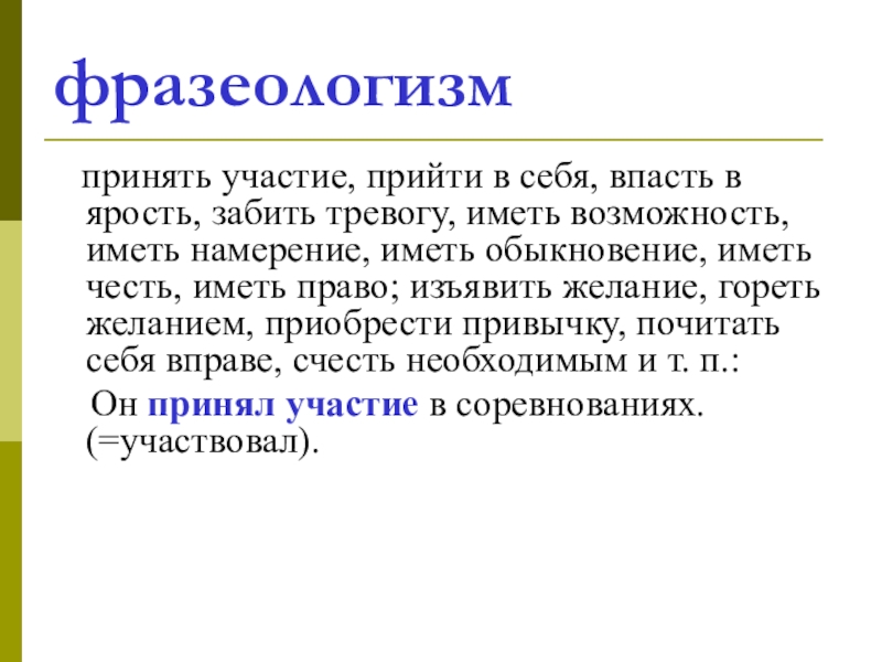 забить тревогу, иметь возможность, иметь намерение, иметь обыкновение, иметь честь, иметь право; изъявить желание, гореть желанием, приобрести привычку, почитать себя вправе, счесть необходимым и т. п.: