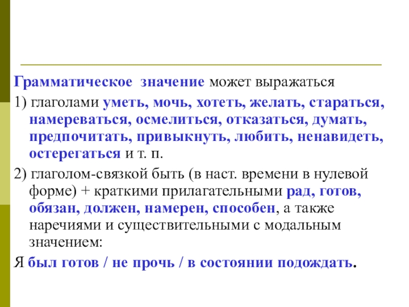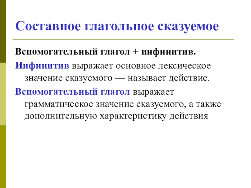 Вспомогательный глагол выражает грамматическое значение сказуемого, а также дополнительную характеристику действия