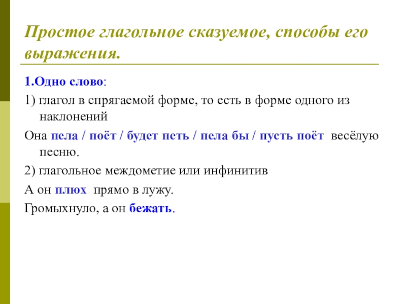 3) сочетанием простого глагольного сказуемого с инфинитивом, который в предложении является обстоятельством цели: Она вышла на крыльцо (зачем?) подышать.