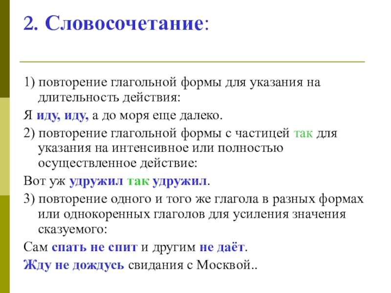 3) повторение одного и того же глагола в разных формах или однокоренных глаголов для усиления значения сказуемого:
