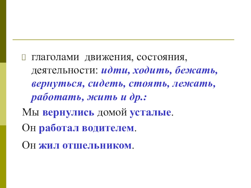 глаголами движения, состояния, деятельности: идти, ходить, бежать, вернуться, сидеть, стоять, лежать,