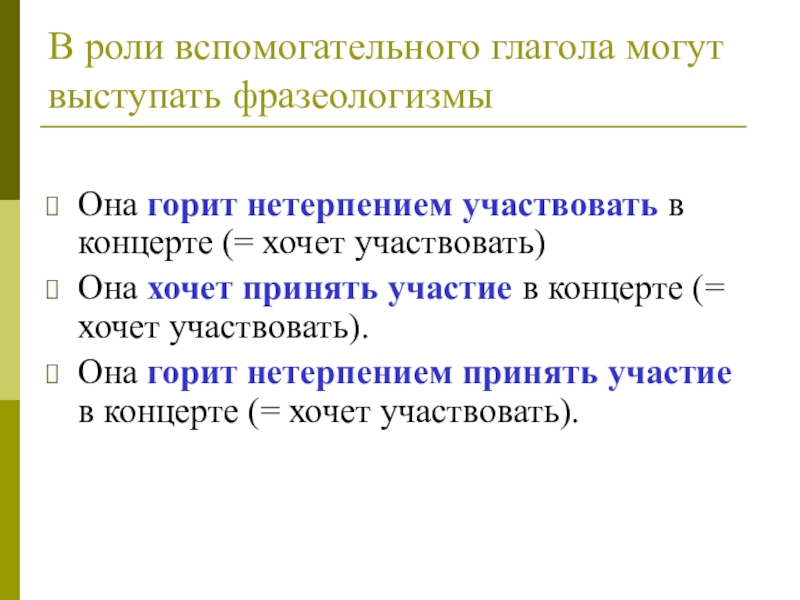 В роли вспомогательного глагола могут выступать фразеологизмы