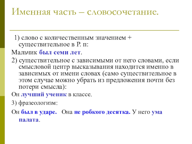 2) существительное с зависимыми от него словами, если смысловой центр высказывания находится именно в зависимых от имени словах (само существительное в этом случае можно убрать из предложения почти без потери смысла):