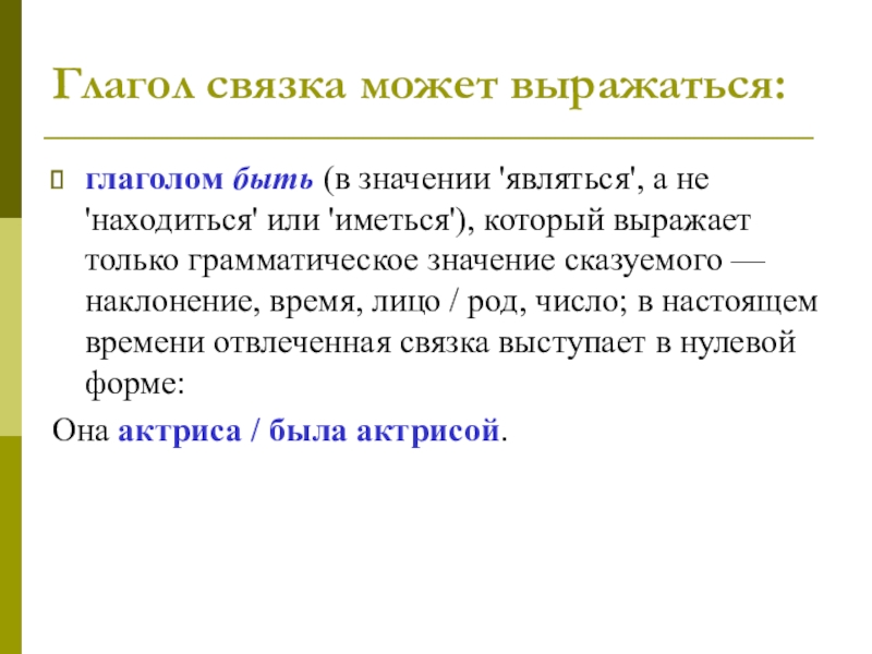 или 'иметься'), который выражает только грамматическое значение сказуемого — наклонение, время, лицо / род, число; в настоящем времени отвлеченная связка выступает в нулевой форме: