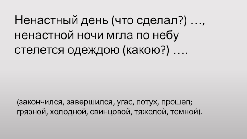 (закончился, завершился, угас, потух, прошел; грязной, холодной, свинцовой, тяжелой, темной).