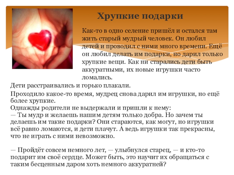 Проходило какое-то время, мудрец снова дарил им игрушки, но ещё более хрупкие.