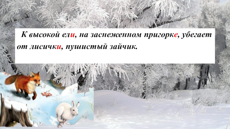 Слайд 4К высокой ели на заснеженном пригорке убегает от лисички пушистый зайчик.
