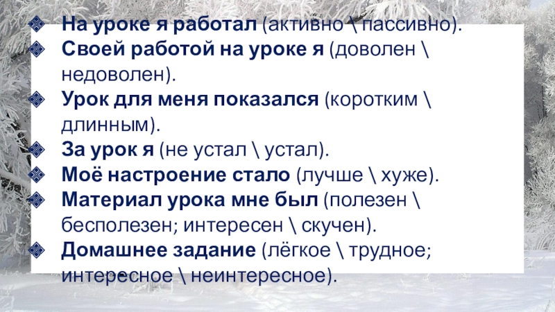 На уроке я работал (активно \ пассивно).Своей работой на уроке я (доволен \ недоволен).Урок для меня показался