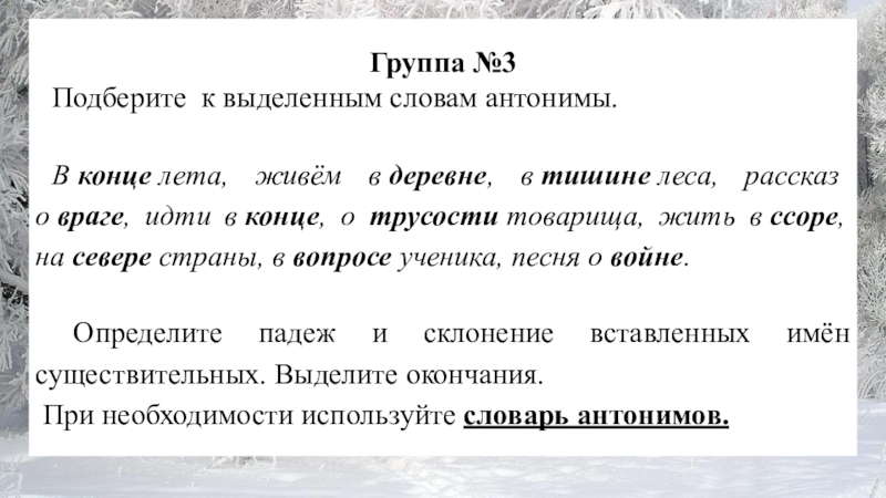 Группа №3Подберите  к выделенным словам антонимы.В конце лета, живём в деревне, в тишине леса, рассказ о враге, идти в конце, о трусости товарища, жить в ссоре,