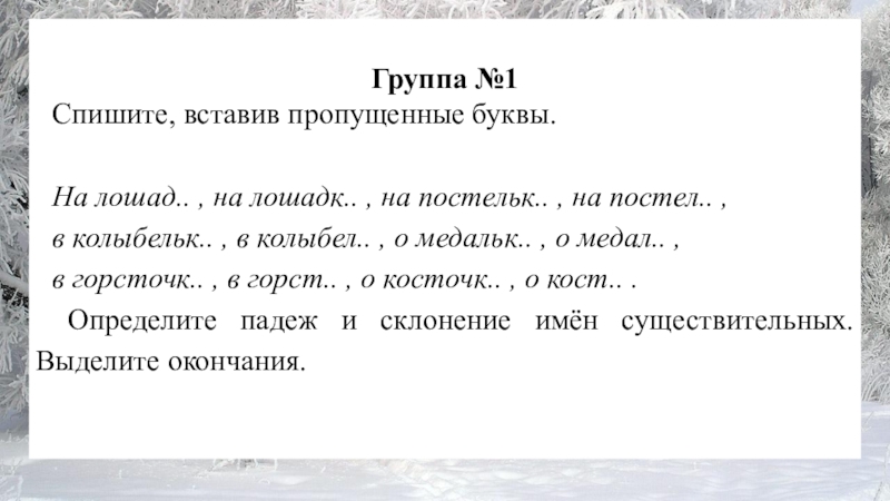 Группа №1Спишите, вставив пропущенные буквы.На лошад.. , на лошадк.. , на постельк.. , на постел.. , в