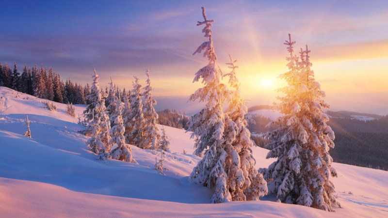 К высокой ели, на заснеженном пригорке, убегает от лисички, пушистый зайчик.