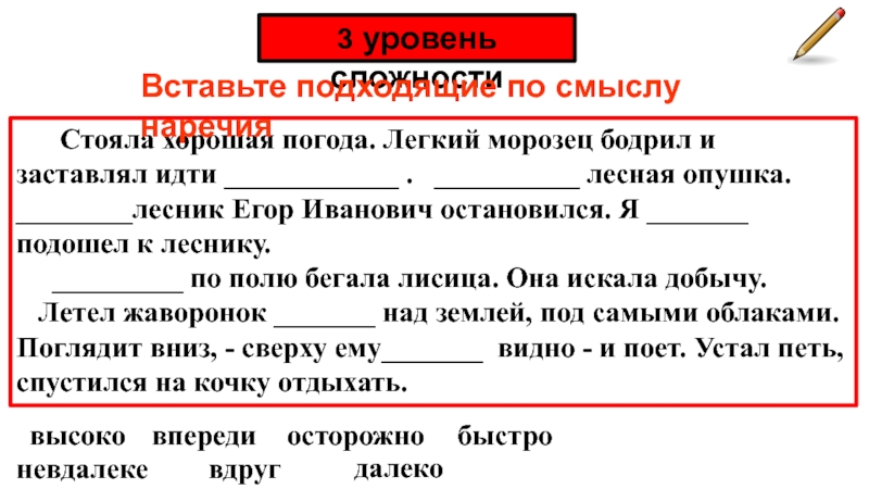 Вставьте подходящие по смыслу наречия