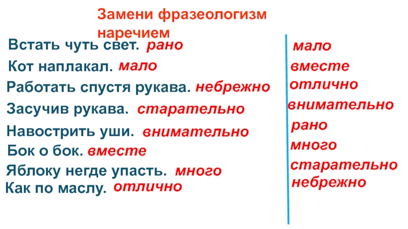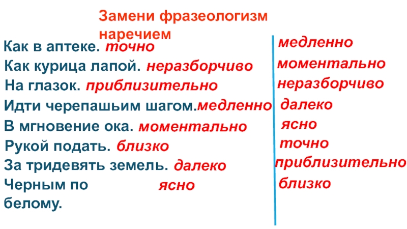Замени фразеологизм наречием