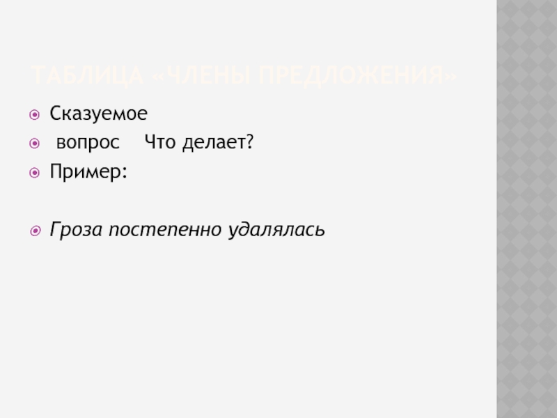 Таблица «Члены предложения»Сказуемое  вопрос  Что делает?Пример:Гроза постепенно удалялась