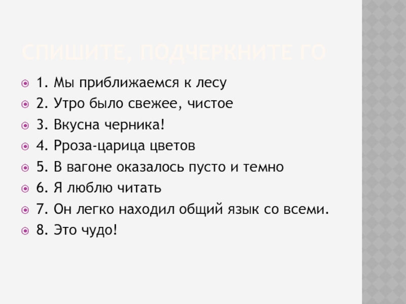 Спишите, подчеркните ГО1. Мы приближаемся к лесу2. Утро было свежее, чистое3. Вкусна черника!4. Рроза-царица цветов5. В вагоне
