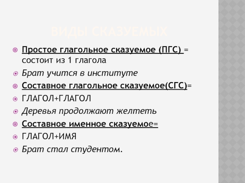 Виды сказуемыхПростое глагольное сказуемое (ПГС) = состоит из 1 глаголаБрат учится в институтеСоставное глагольное сказуемое(СГС)=ГЛАГОЛ+ГЛАГОЛДеревья продолжают желтетьСоставное
