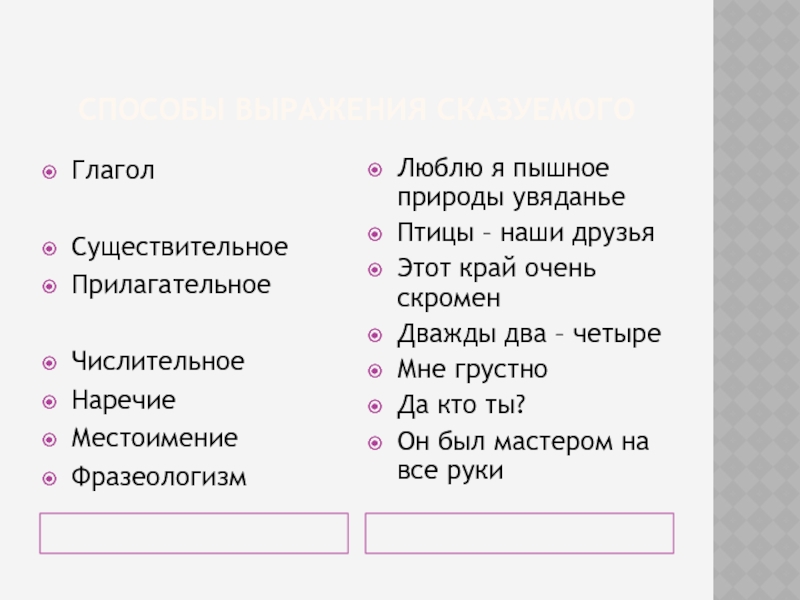 Способы выражения сказуемогоГлаголСуществительноеПрилагательноеЧислительное НаречиеМестоимениеФразеологизмЛюблю я пышное природы увяданьеПтицы – наши друзьяЭтот край очень скроменДважды два – четыреМне