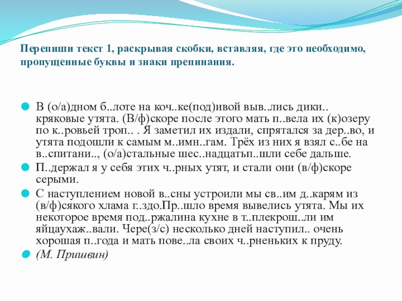 С наступлением новой в..сны устроили мы св..им д..карям из (в/ф)сякого хлама г..здо.Пр..шло время вывелись утята. Мы их некоторое время под..ржалина кухне в т..плекрош..ли им яйцаухаж..вали. Чере(з/с) несколько дней наступил.. очень хорошая п..года и мать пове..ла своих ч..рненьких к пруду.