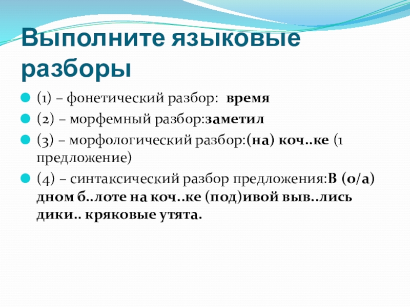 В (о/а)дном б..лоте на коч..ке(под)ивой выв..лись дики.. кряковые утята. (В/ф)скоре после этого мать п..вела их (к)озеру по к..ровьей троп.. . Я заметил их издали, спрятался за дер..во, и утята подошли к самым м..имн..гам. Трёх из них я взял с..бе на в..спитани.., (о/а)стальные шес..надцатьп..шли себе дальше.