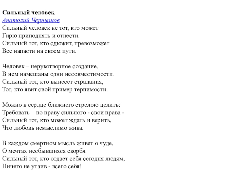 тот, кто сдюжит, превозможет Все напасти на своем пути. Человек – нерукотворное создание, В нем намешаны одни несовместимости. Сильный тот, кто вынесет страдания, Тот, кто явит свой пример терпимости. Можно в сердце ближнего стрелою целить: Требовать – по праву сильного - свои права - Сильный тот, кто может ждать и верить, Что любовь немыслимо жива. В каждом смертном мысль живет о чуде, О мечтах несбывшихся скорбя. Сильный тот, кто отдает себя сегодня людям, Ничего не утаив - всего себя!