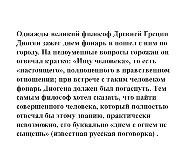 с ним по городу. На недоуменные вопросы горожан он отвечал кратко: «Ищу человека», то есть «настоящего», полноценного в нравственном отношении; при встрече с таким человеком фонарь Диогена должен был погаснуть. Тем самым философ хотел сказать, что найти совершенного человека, который полностью отвечал бы этому званию, практически невозможно, его буквально «днем с огнем не сыщешь» (известная русская поговорка) .