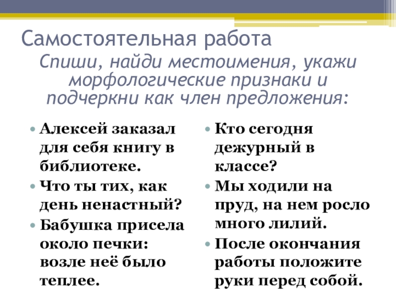 Спиши, найди местоимения, укажи морфологические признаки и подчеркни как член предложения: