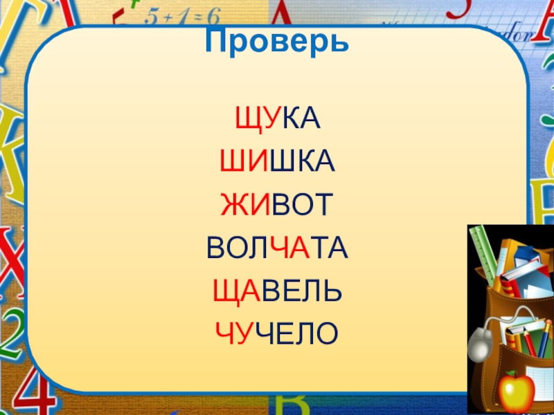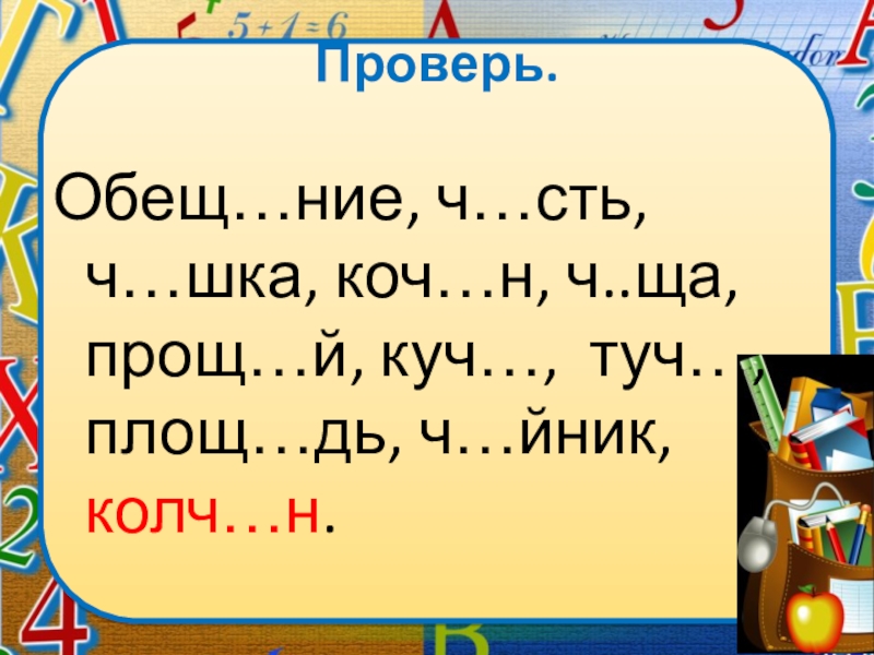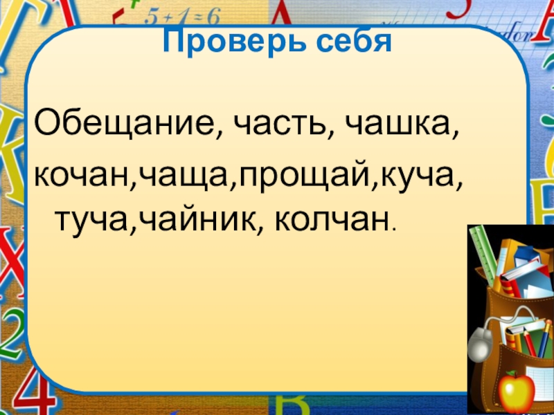 Проверь себяОбещание, часть, чашка,кочан,чаща,прощай,куча,туча,чайник, колчан.